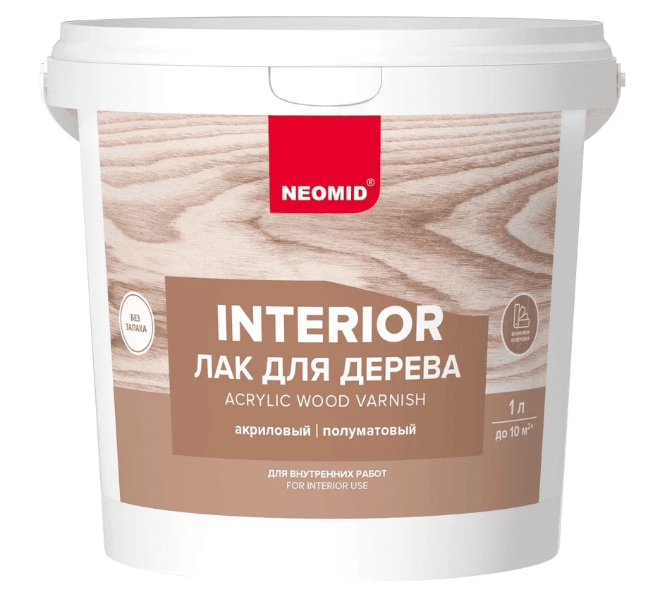 Акриловый лак для древесины NEOMID interior 1л предназначен для эффективной защиты и финишной декоративной отделки деревянной поверхности внутри помещений и под навесом. сохраняет и подчёркивает естественную текстуру древесины.