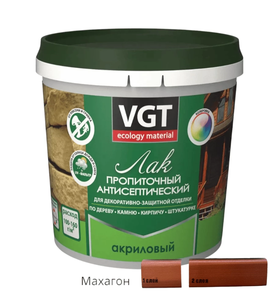 Пропиточный акриловый лак с антисептиком для дерева и камня VGT махагон, 2,2 кг предназначен для защитно-декоративной обработки различных поверхностей внутри и снаружи помещений.