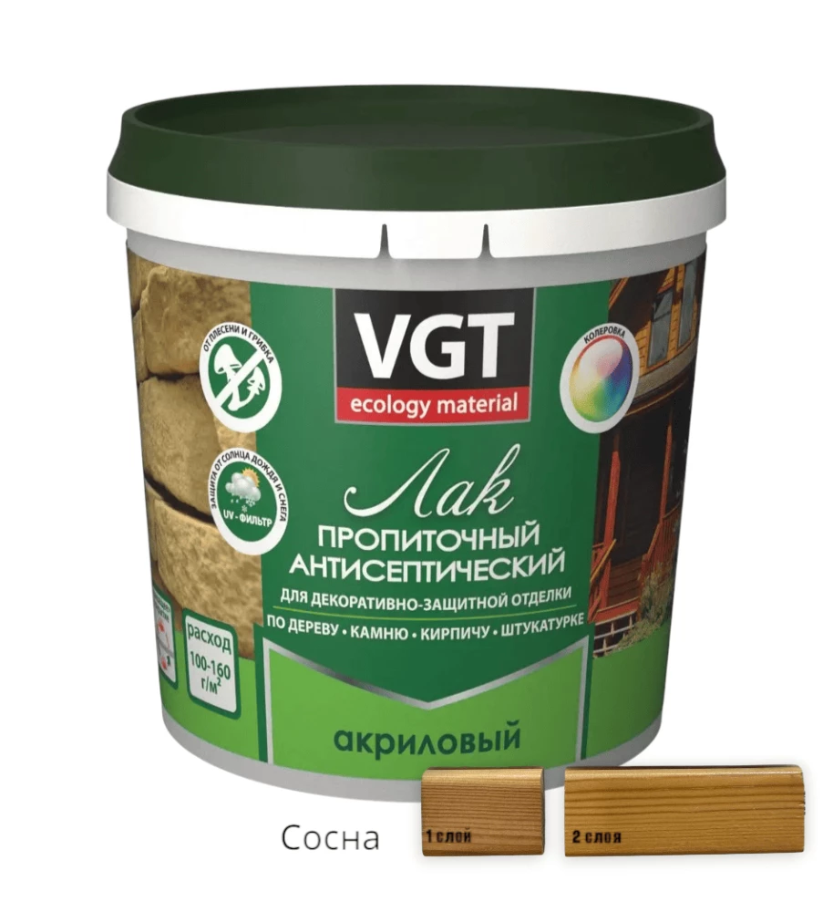 Пропиточный акриловый лак с антисептиком для дерева и камня VGT сосна, 0,9 кг предназначен для защитно-декоративной обработки различных поверхностей внутри и снаружи помещений.