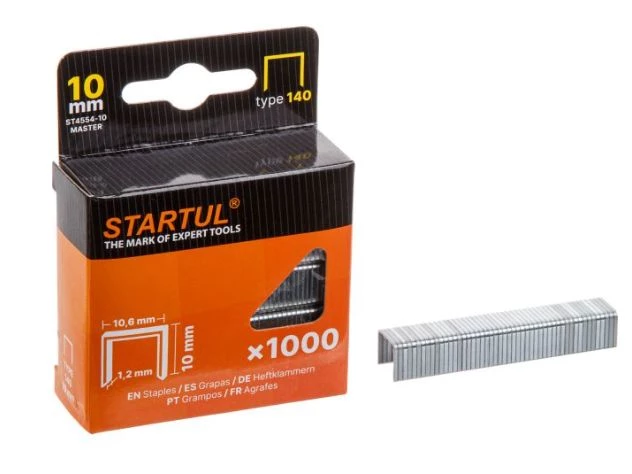 Скобы 10 мм тип 140 1000 штук STARTUL Master (ST4554-10) - идеальный выбор для тех, кто ищет надёжное и качественное крепление материалов к поверхностям из фанеры, дерева и ДСП.