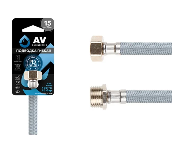 Гибкая подводка для воды AV Engineering nylon Lt гайка 1/2" - штуцер 1/2" 150 см AVE209150 предназначена для подключения отдельного сантехнического оборудования к основной системе водоснабжения и изготавливается только из высококачественных материалов, что обеспечивает высокую эластичность и многолетнюю исправную работу.