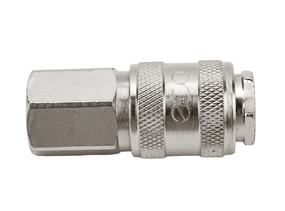 Быстросъёмное соединение ECO «МАМА × внутренняя резьба 3/8"» (арт. AS-F/FT38) — стальной фитинг для пневматических систем с автоматическим клапаном, перекрывающим канал при отсоединении.
