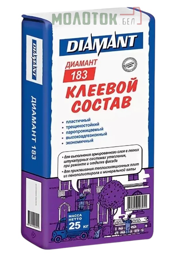 Универсальный клей (КС) Диамант 183 отлично подойдет как для приклеивания любых теплоизоляционных материалов, так и для выполнения армирующего слоя по теплоизоляции.