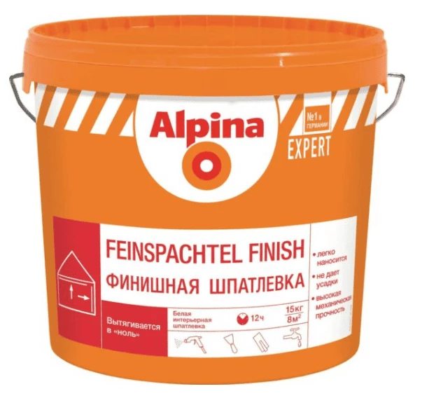 Шпатлевка полимерная финишная ALPINA Expert Feinspachtel Finish белая 15 кг предназначена для нанесения на известково-цементные штукатурки, бетон, гипсовые штукатурки и шпатлевки, гипсокартон, старые матовые дисперсионные краски.