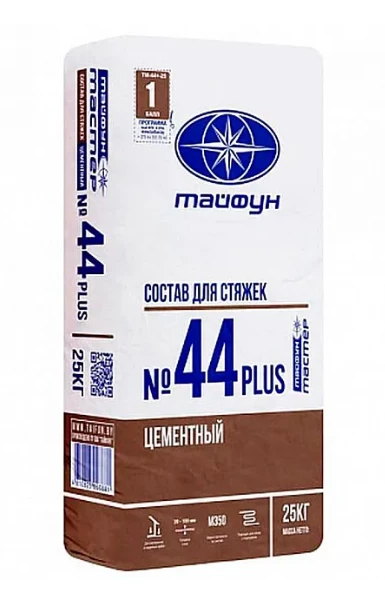 Состав цементный для стяжек «Тайфун Мастер» №44 PLUS предназначен для устройства цементной стяжки толщиной от 20 до 100 мм,