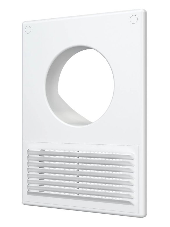 Имеет съемную решетку с наклонными жалюзи, защитную сетку от насекомых и девиатор для предотвращения обратного потока.